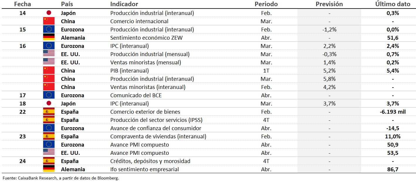 Los anuncios en distintos sentidos de la política comercial estadounidense supusieron fuertes pérdidas y ciertos rebotes en los distintos rincones del mercado, si bien el sentimiento inversor fue mayoritariamente negativo. Así, los principales índices bursátiles de EE. UU. registraron avances tras la pausa anunciada en los aranceles recíprocos a numerosos países y el recrudecimiento de estos para con China, si bien continúan aún lejos de sus máximos registrados apenas en febrero. En los índices europeos y emergentes la semana fue peor, con pérdidas generalizadas, más intensas en China. Por otro lado, también las expectativas de tipos de interés de los bancos centrales cotizadas por los implícitos del mercado monetario pasaron a descontar, para la Fed, tres bajadas tras el anuncio de la pausa arancelaria, frente a las cuatro que habían cotizado anteriormente. Para el BCE, no obstante, se mantuvieron más estables, y siguieron descontando tres bajadas más este año. En cuanto a la deuda soberana, la volatilidad fue menor y la rentabilidad de la deuda estadounidense aumentó en todos sus tramos, si bien con un fuerte apuntamiento de pendientes. Este movimiento es inusual en un contexto de mayor incertidumbre y menor apetito por el riesgo inversor en el que tradicionalmente los bonos del Tesoro estadounidense actúan como activo refugio. La lectura no es clara por ahora y podría deberse a una o varias razones simultáneamente: a una reevaluación del riesgo soberano en EE. UU. por parte de los inversores, dada una política económica más incierta y el previsible empeoramiento fiscal; a ventas de treasuries dada su liquidez, relacionadas con el cierre apresurado de posiciones especulativas en un mercado volátil; o a una posible venta de China de parte de su cartera de treasuries. La deuda soberana de la eurozona, por su parte, cierra la semana prácticamente plana. Por otro lado, en el mercado de divisas se dio un movimiento similar al de los treasuries: pese al aumento de la incertidumbre, el dólar se depreció frente a sus principales pares, en particular frente al euro y frente al franco suizo, que capitalizó su rol de activo refugio y se apreció con intensidad. Por último, en el mercado de materias primas, los precios de las referencias europeas de petróleo y gas natural prolongaron sus caídas, ante las dudas sobre la demanda global, mientras que los metales preciosos, como el oro, avanzaron en un movimiento de búsqueda de refugio por parte de los inversores.