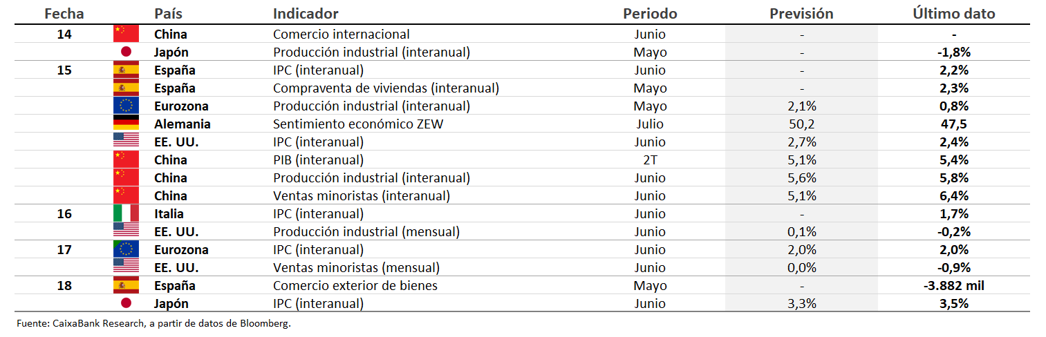 Los mercados financieros han mostrado un comportamiento positivo en una semana sin apenas referencias macroeconómicas relevantes, donde los inversores han estado pendientes de la evolución de las negociaciones comerciales, especialmente tras la decisión de EE. UU. de extender hasta el 1 de agosto el plazo para la puesta en marcha de los aranceles recíprocos (para más información, véase la primera noticia de la sección de Economía internacional). Las principales bolsas de la eurozona reaccionaron con calma y se anotaron subidas en la semana (el EuroStoxx se revalorizó un 1,6%), mientras que el comportamiento de las bolsas estadounidenses fue más plano, con ligeras caídas semanales en algunos índices (Nasdaq se dejó un 0,2% y el Dow Jones un 0,4%). En renta fija, los rendimientos soberanos en la eurozona repuntaron en la semana (el bund aumentó casi 8 p. b., hasta el 2,69%) y el comportamiento fue algo más contenido en EE. UU. (el treasury 10 años repuntó en la primera parte de la semana, pero cerró prácticamente en los niveles de la anterior, 4,36%). En cuanto a política monetaria, las actas de la Fed reflejaron una división interna: solo una minoría apoya un recorte en julio, mientras que la mayoría considera que los tipos actuales no están lejos del nivel neutral. El mercado sigue descontando dos bajadas en 2025, en septiembre y diciembre. En el BCE, las expectativas se mantienen ancladas en un único recorte adicional este año (depo al 1,75%). En divisas, el dólar ha recuperado algo de terreno respecto al euro (+0,6% en la semana) y cierra la semana en 1,168. En materias primas, el precio del petróleo se mantuvo volátil: subió tras el anuncio de la OPEP+ de aumentar la producción desde agosto, pero retrocedió al cierre de la semana por dudas sobre la demanda y posibles ajustes futuros. El cobre, por su parte, se disparó un 10% en la semana, impulsado por el arancel del 50% que anunció Trump a partir del 1 de agosto.