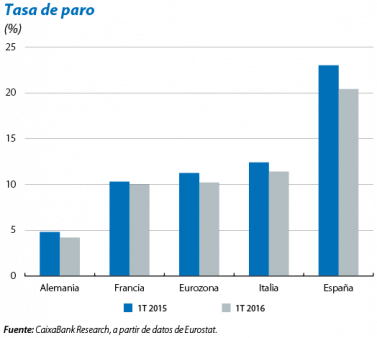 Continúa la recuperación gradual del mercado laboral. Los datos de cierre del 1T 2016 muestran una reducción sostenida, aunque lenta, de la tasa de paro en el conjunto de la eurozona, que se situó en el 10,2% (comparado con el 11,2% en marzo de 2015). La mejora también ha sido generalizada en los principales países. Concretamente, España ha contribuido de manera significativa a esta disminución, al cerrar el 1T 2016 con una tasa de paro 2,6 p. p. por debajo de la de marzo de 2015. En el conjunto de la eurozona, la tasa de paro todavía se encuentra en niveles elevados y, según las previsiones de CaixaBank Research, irá disminuyendo de forma gradual de aquí en adelante. De nuevo, esta gradualidad pone de manifiesto la importancia de llevar a cabo reformas estructurales que, apoyadas por el entorno monetario acomodaticio, estimulen el crecimiento potencial de la economía y permitan acelerar la creación de puestos de trabajo.