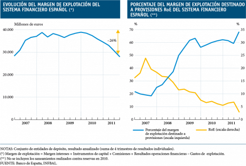 Por último, como ya se ha señalado, las entidades presentan un elevado volumen de créditos morosos y adjudicados, que en la actualidad representan el 11% del crédito a sectores privados residentes. Estos activos generan un doble impacto negativo en la cuenta de resultados, ya que además de la necesidad de provisionarlos, afectan negativamente al margen de intereses al tratarse de activos que necesitan seguir siendo financiados pero que no generan ingresos financieros.