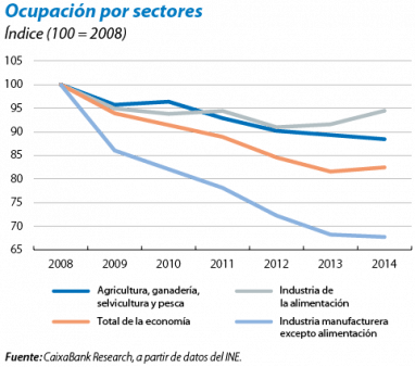 A pesar de la tendencia secular a la terciarización de la economía, el sector agroalimentario es un pilar fundamental del tejido productivo español. Si bien la actividad primaria ha ido perdiendo peso,1 la industria alimentaria, encargada de la elaboración de alimentos procesados de mayor valor añadido, ha mantenido su aportación alrededor del 3,0% del VAB total y se ha consolidado como la primera rama industrial: en 2014 aportó el 22,3% del VAB de la industria manufacturera y ocupó a 430.400 personas. Asimismo, es destacable que la cifra de ocupados en esta rama no ha sufrido caídas tan significativas como otros sectores (véase el primer gráfico).